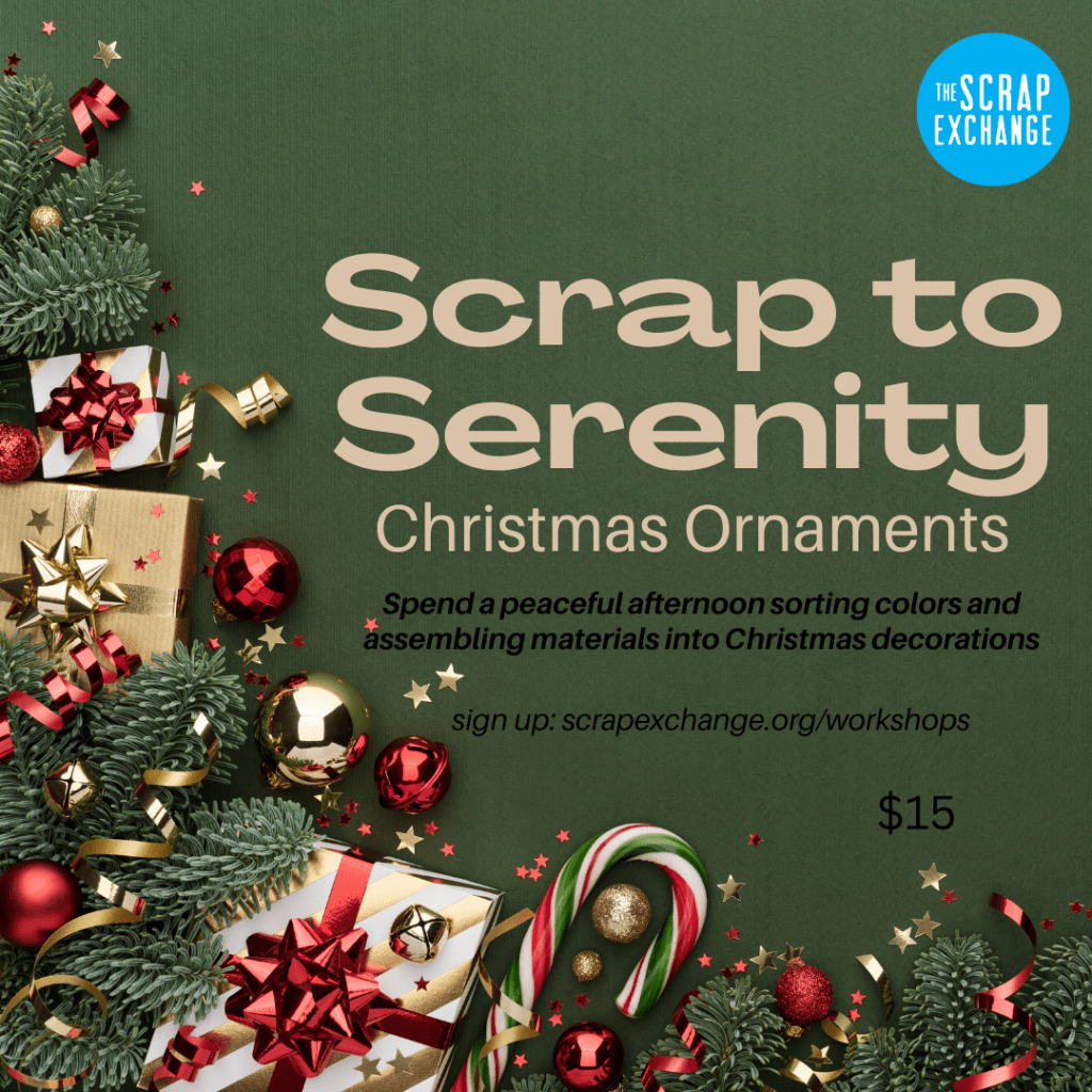 Scrap to Serenity, Christmas Edition: Spend a peaceful afternoon sorting colors and assembling materials into Christmas ornaments or decorations. This special Scrap to Serenity: Christmas Edition class offers a calm, creative way to welcome the season or relax from holiday stress.