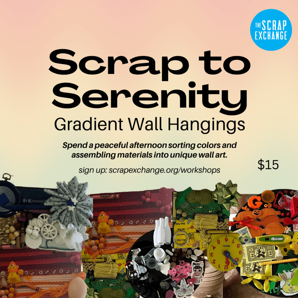 Scrap to Serenity: Transform surplus materials and scraps into works of art! Spend a peaceful afternoon sorting colors and assembling materials into gradient wall hangings. This meditative process combines creativity with mindfulness as you give new life to overlooked items. All supplies are provided—just bring your imagination and enjoy the soothing rhythm of crafting in community.