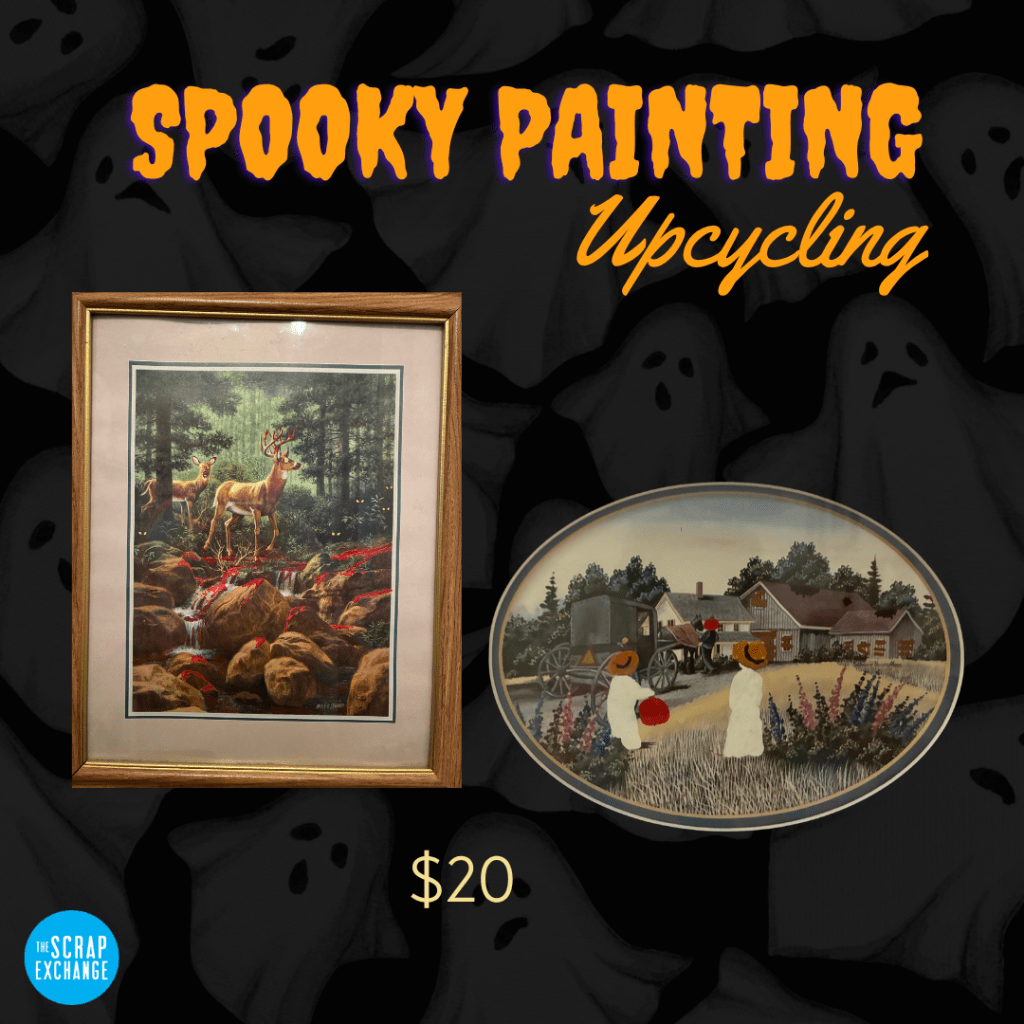 Spooky Painting Upcycling: Transform forgotten thrift store art into chilling Halloween décor! In this workshop, you’ll choose from a selection of thrifted paintings and learn creative techniques to give them a one-of-a-kind twist, perfect for adding scrappy, spooky charm to your home.
