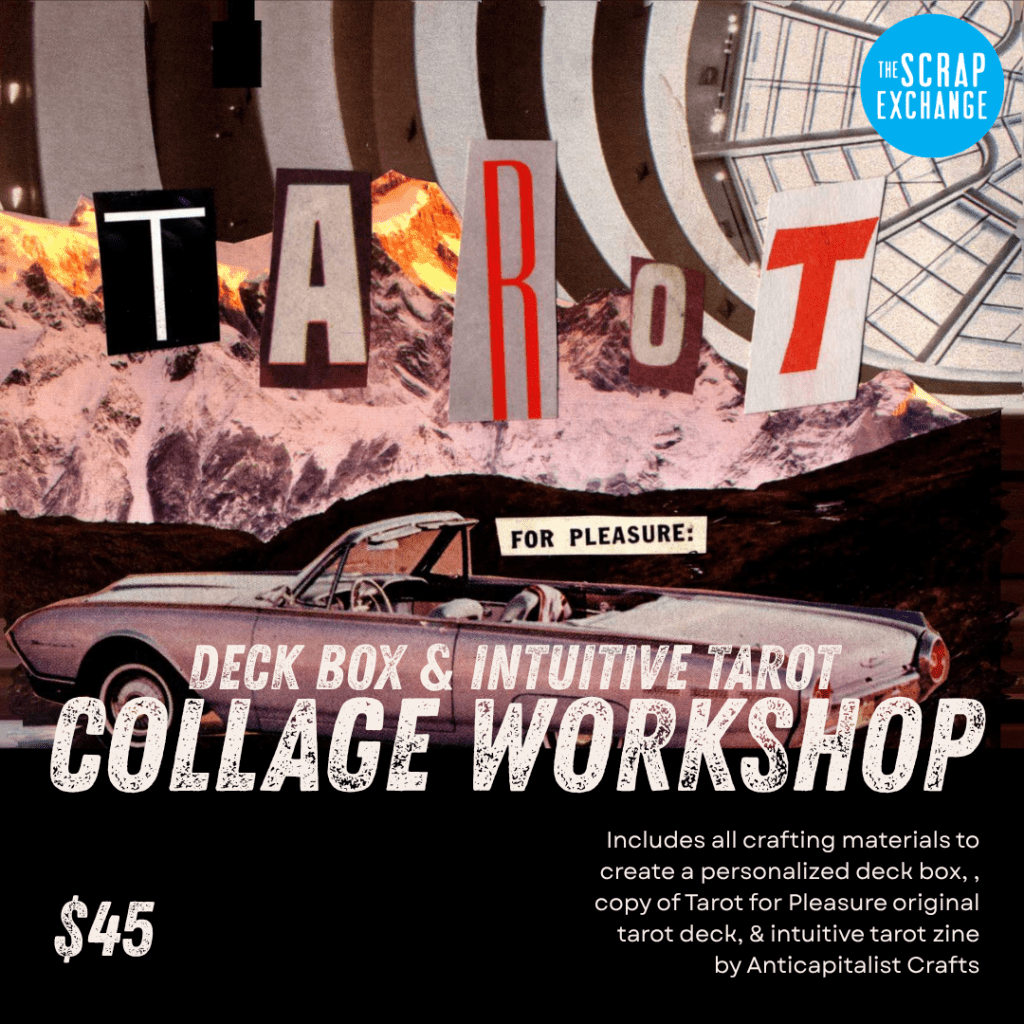 Tarot for Pleasure Collage Party: Join Anticapitalist Crafts for an evening of creativity, intuition, and self-discovery. You’ll create your own personalized deck box using collage techniques and reclaimed materials from The Scrap Exchange, and be introduced to the basics of intuitive tarot reading (a practice that emphasizes personal connection and storytelling over memorization.) We provide all materials needed, plus a copy of Tarot for Pleasure and our intuitive tarot zine. Whether you’re new to tarot or a seasoned reader looking to reconnect with your intuition, this workshop offers a welcoming, creative space to make something beautiful and uniquely your own.